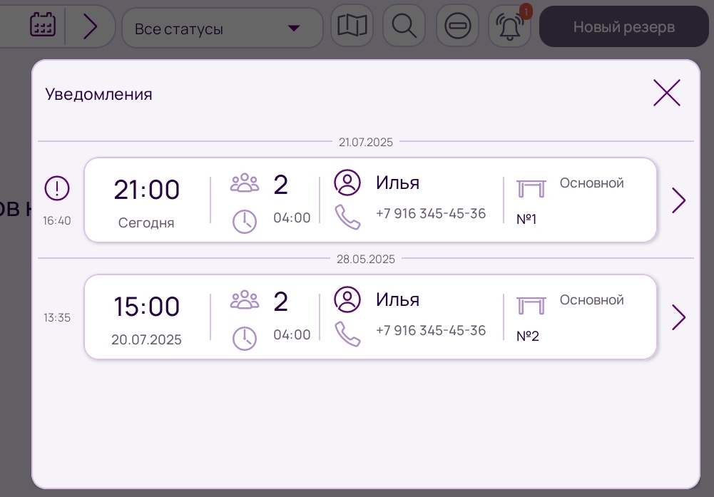 Необработанные уведомления отмечены маркером «Восклицательный знак» и не попадают в общий список резервов. Чтобы обработать уведомление, необходимо нажать на него: оно окажется в списке резервов, счетчик не обработанных уведомлений уменьшится на единицу, маркер «Восклицательный знак» рядом с ним в панели уведомлений исчезнет.