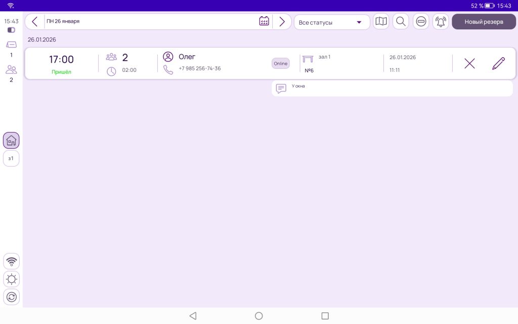 Для отмены резерва нажмите на кнопку «Крестик» там же. Отменённый хостес резерв остаётся в списке со статусом «Отменён хостес». Чтобы вернуть его, используйте кнопку восстановления резерва.