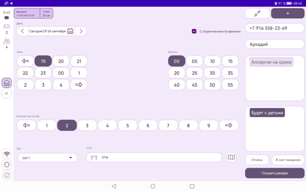 Также можно поместить резерв в лист ожидания, если есть не вся информация по резерву или нет возможности указать подходящий стол в момент создания резерва.