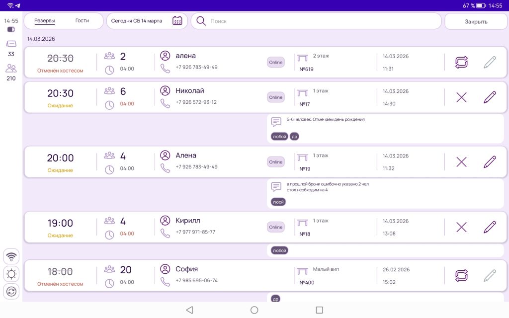 На экране поиска Вы можете найти резервы или гостей за конкретную дату или промежуток времени: